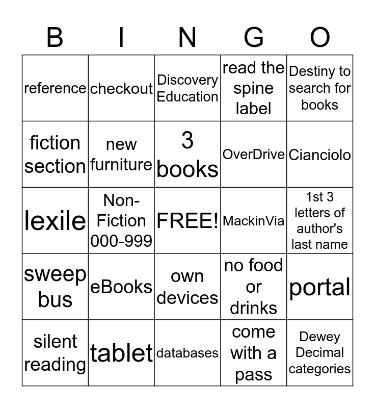 This bingo card has a free space and 24 words: eBooks, tablet, 3 books, silent reading, Destiny to search for books, reference, fiction section, checkout, MackinVia, own devices, OverDrive, lexile, no food or drinks, portal, new furniture, come with a pass, 1st 3 letters of author's last name, Discovery Education, Cianciolo, Non-Fiction 000-999, Dewey Decimal categories, sweep bus, read the spine label and databases.