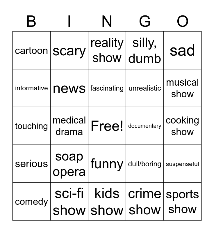 This bingo card has a free space and 29 words: comedy, drama, medical drama, game show, cartoon, reality show, news, soap opera, documentary, sci-fi show, cooking show, sports show, kids show, crime show, musical show, actress/actor, funny, serious, sad, touching, dull/boring, realistic, unrealistic, informative, silly, dumb, scary, suspenseful, fascinating and tv.