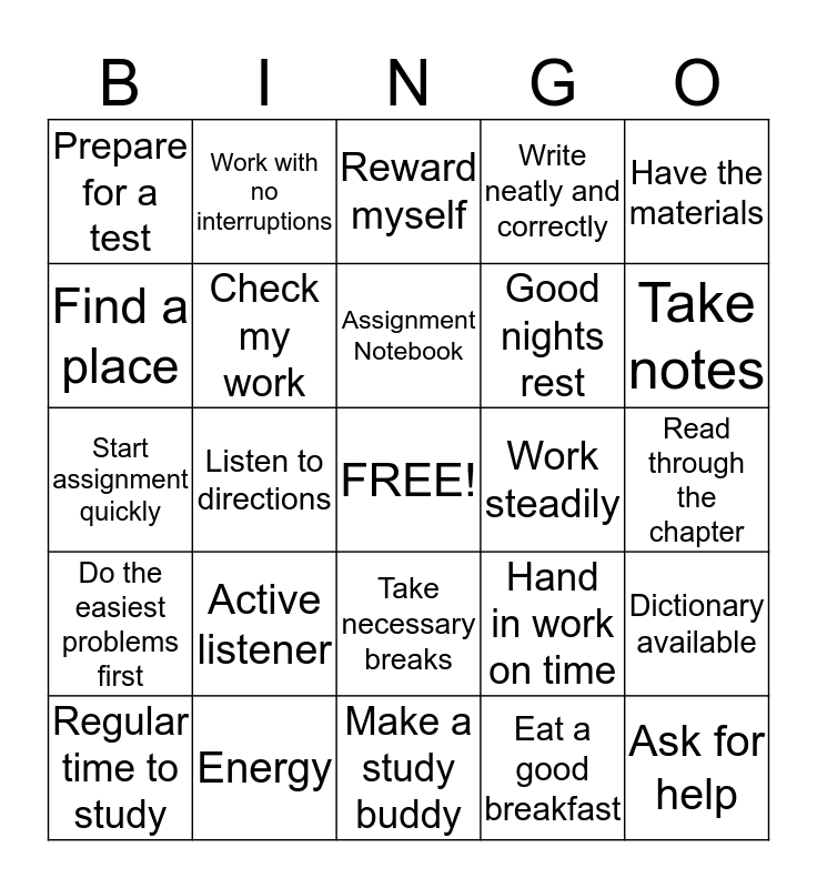 This bingo card has a free space and 24 words: Active listener, Energy, Assignment Notebook, Regular time to study, Have the materials, Prepare for a test, Find a place, Work with no interruptions, Work steadily, Take necessary breaks, Good nights rest, Start assignment quickly, Hand in work on time, Dictionary available, Check my work, Eat a good breakfast, Read through the chapter, Reward myself, Take notes, Listen to directions, Ask for help, Do the easiest problems first, Write neatly and correctly and Make a study buddy.