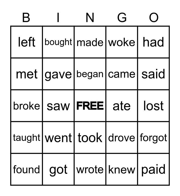 This bingo card has a free space and 24 words: went, got, began, found, had, left, met, bought, ate, took, came, broke, drove, forgot, gave, knew, lost, made, said, saw, paid, taught, woke and wrote.