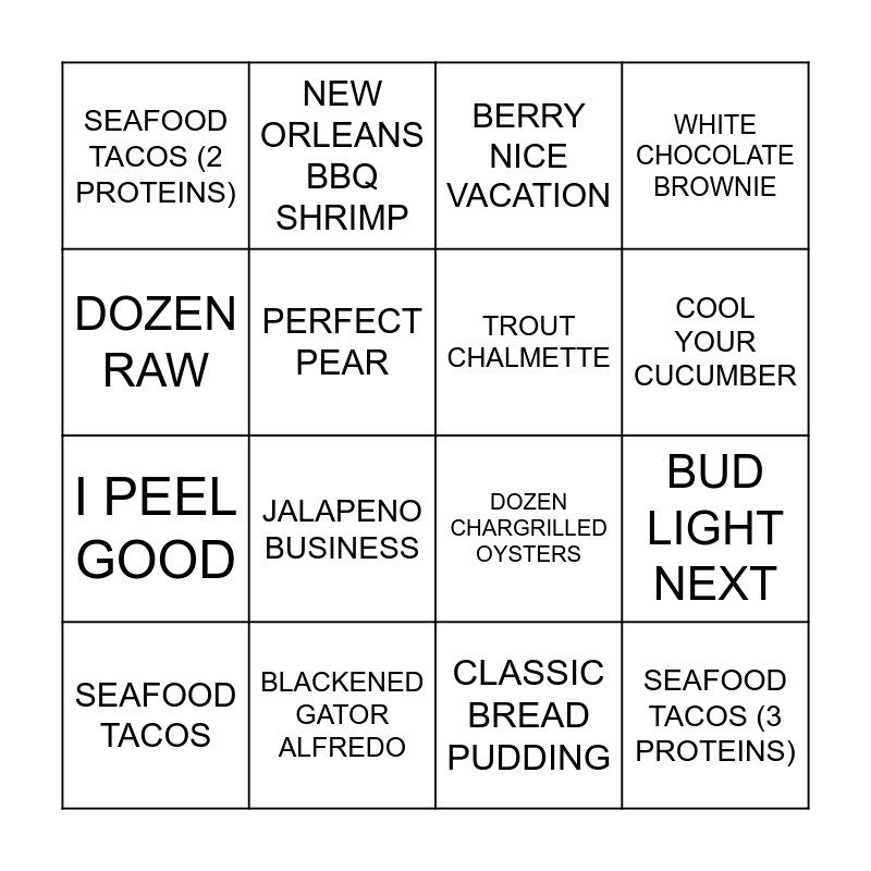 This bingo card has 16 words: BLACKENED GATOR ALFREDO, BUD LIGHT NEXT, BERRY NICE VACATION, SEAFOOD TACOS (2 PROTEINS), I PEEL GOOD, NEW ORLEANS BBQ SHRIMP, DOZEN CHARGRILLED OYSTERS, CLASSIC BREAD PUDDING, DOZEN RAW, PERFECT PEAR, SEAFOOD TACOS, WHITE CHOCOLATE BROWNIE, JALAPENO BUSINESS, COOL YOUR CUCUMBER, TROUT CHALMETTE and SEAFOOD TACOS (3 PROTEINS).