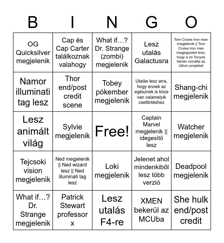 This bingo card has a free space and 24 words: Ned megjelenik || Ned wizard lesz || Ned illuminati tag lesz, Patrick Stewart professor x, Tobey pókember megjelenik, What if…? Dr. Strange megjelenik, Tom Cruise Iron man megjelenik || Tom Cruise iron man megjegyzést tesz, hogy a mi Tonynk bénán csinálta az Ultron projektet, OG Quicksilver megjelenik, Namor illuminati tag lesz, Cap és Cap Carter találkoznak valahogy, Captain Marvel megjelenik || idegesítő lesz, Loki megjelenik, Utalás lesz arra, hogy ennek az egésznek is köze van valamelyik csettintéshez, Lesz animált világ, Jelenet ahol mindenkiből lesz több verzió, Deadpool megjelenik, Thor end/post credit scene, XMEN bekerül az MCUba, Watcher megjelenik, What if…? Dr. Strange (zombi) megjelenik, Shang-chi megjelenik, Sylvie megjelenik, She hulk end/post credit, Tejcsoki vision megjelenik, Lesz utalás Galactusra and Lesz utalás F4-re.
