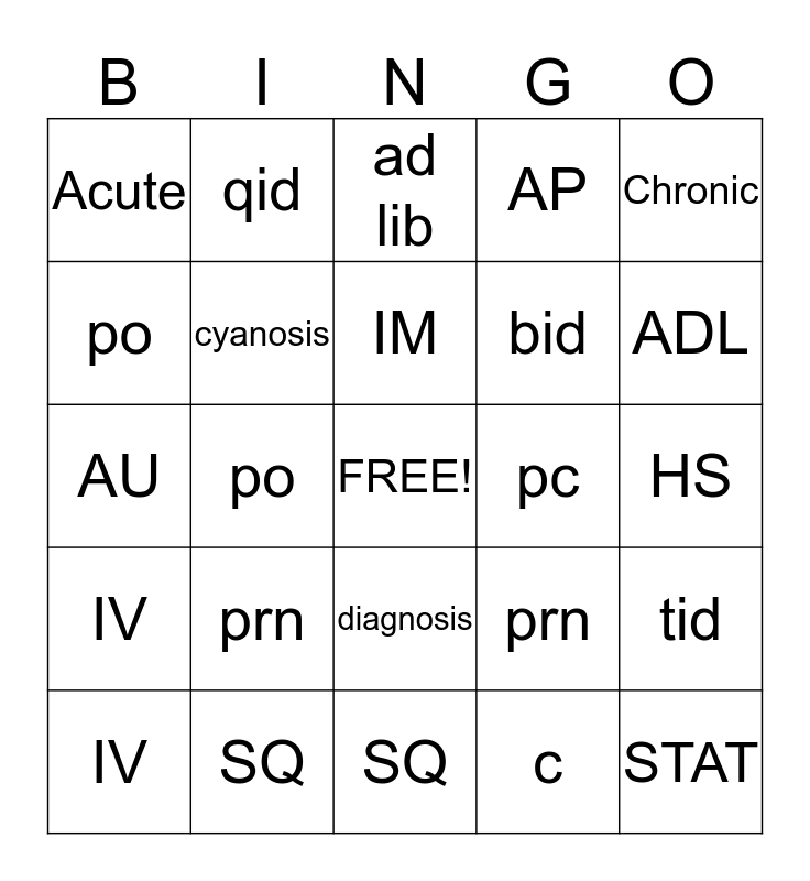 This bingo card has a free space and 24 words: prn, SQ, IM, IV, Chronic, Acute, po, qid, pc, diagnosis, bid, AU, prn, tid, cyanosis, c, HS, ad lib, ADL, po, STAT, IV, AP and SQ.