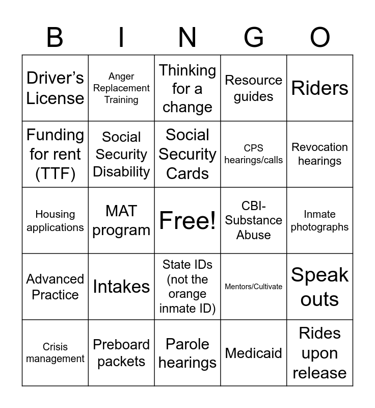 This bingo card has a free space and 28 words: Speak outs, Court hearings, CPS hearings/calls, Medicaid, Funding for rent (TTF), Thinking for a change, Anger Replacement Training, Advanced Practice, CBI-Substance Abuse, Crisis management, Housing applications, Resource guides, Preboard packets, Parole hearings, Revocation hearings, Coordinate reentry meetings, Intakes, Social Security Disability, Social Security Cards, State IDs (not the orange inmate ID), Driver’s License, Jobs via voc rehab, Rides upon release, MAT program, Inmate photographs, Mentors/Cultivate, Riders and APSI.