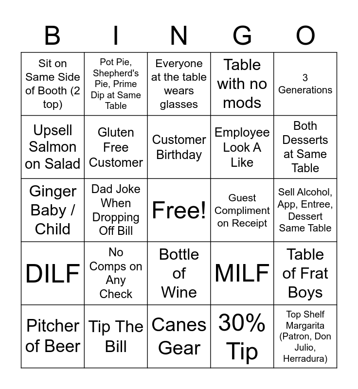 This bingo card has a free space and 24 words: Pitcher of Beer, No Comps on Any Check, Customer Birthday, 30% Tip, 3 Generations, Sit on Same Side of Booth (2 top), Pot Pie, Shepherd's Pie, Prime Dip at Same Table, Everyone at the table wears glasses, Guest Compliment on Receipt, Sell Alcohol, App, Entree, Dessert Same Table, Ginger Baby / Child, Gluten Free Customer, MILF, Table of Frat Boys, Upsell Salmon on Salad, Tip The Bill, Canes Gear, Table with no mods, Both Desserts at Same Table, DILF, Dad Joke When Dropping Off Bill, Bottle of Wine, Employee Look A Like and Top Shelf Margarita (Patron, Don Julio, Herradura).