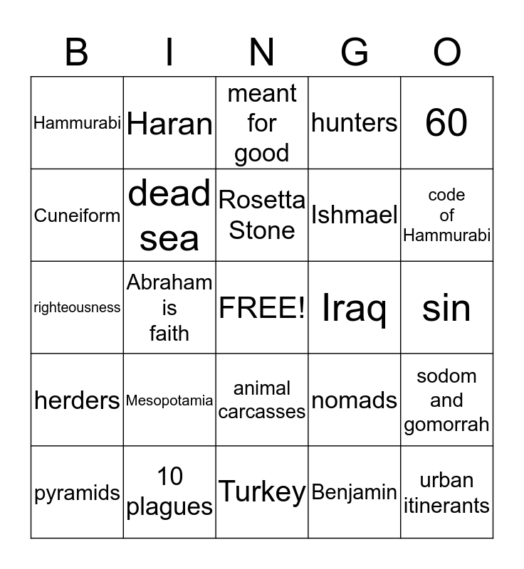 This bingo card has a free space and 24 words: Mesopotamia, 10 plagues, Rosetta Stone, pyramids, 60, Hammurabi, Cuneiform, Haran, Iraq, animal carcasses, Ishmael, righteousness, nomads, sodom and gomorrah, dead sea, Benjamin, sin, meant for good, code of Hammurabi, Abraham is faith, urban itinerants, herders, hunters and Turkey.