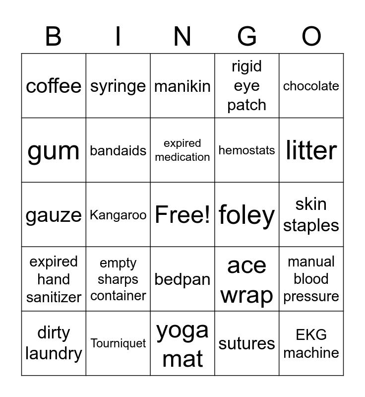 This bingo card has a free space and 24 words: empty sharps container, Tourniquet, expired medication, dirty laundry, chocolate, coffee, gum, syringe, foley, bedpan, hemostats, gauze, ace wrap, manual blood pressure, bandaids, sutures, skin staples, manikin, litter, Kangaroo, EKG machine, expired hand sanitizer, rigid eye patch and yoga mat.
