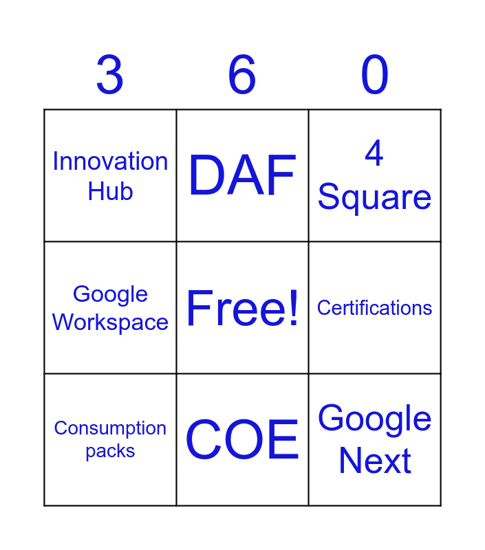 This bingo card has a free space and 15 words: Go Big with Data, Catalyst Market, 4 Square, Innovation Hub, COE, Google Next, Partner Advantage, Funding, Certifications, High Growth, PSF, Google Workspace, Consumption packs, DAF and Grapevine.