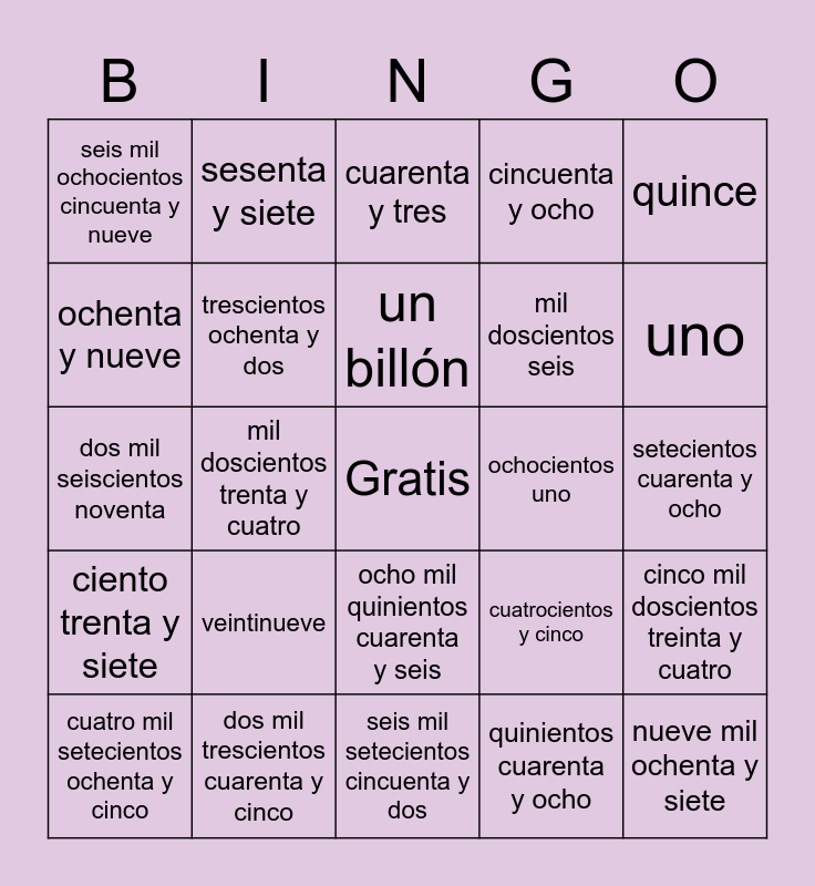 This bingo card has a free space and 29 words: cuatro mil setecientos ochenta y cinco, trescientos sesenta y cuatro, mil doscientos trenta y cuatro, cinco, seis mil ochocientos cincuenta y nueve, cuarenta y tres, trescientos ochenta y dos, veintinueve, ochocientos uno, dos mil trescientos cuarenta y cinco, setecientos cuarenta y ocho, nueve mil ochenta y siete, seis mil setecientos cincuenta y dos, quinientos cuarenta y ocho, uno, noventa, ocho mil quinientos cuarenta y seis, ciento trenta y siete, quince, dos mil seiscientos noventa, cuatrocientos y cinco, trenta y dos, mil doscientos seis, ochenta y nueve, cincuenta y ocho, sesenta y siete, cinco mil doscientos treinta y cuatro, un billón and dos mil doscientos veintidós.