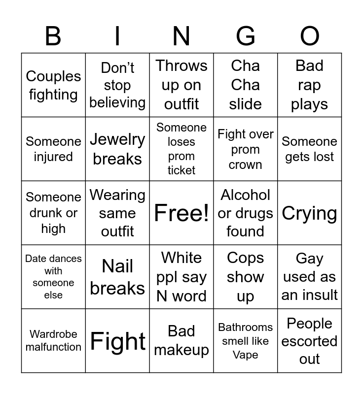 This bingo card has a free space and 29 words: Wardrobe malfunction, Late to prom, Wearing same outfit, Heels break, Couples fighting, Throws up on outfit, Jewelry breaks, Nail breaks, Alcohol or drugs found, Fight, Crying, People escorted out, Bad makeup, Bathrooms smell like Vape, Someone gets lost, Parents get on the dance floor, White ppl say N word, Date dances with someone else, Bad rap plays, Someone drunk or high, Cops show up, Someone faints, Fight over prom crown, Someone injured, Cha Cha slide, Don’t stop believing, Gay used as an insult, Someone loses prom ticket and Someone loses phone.