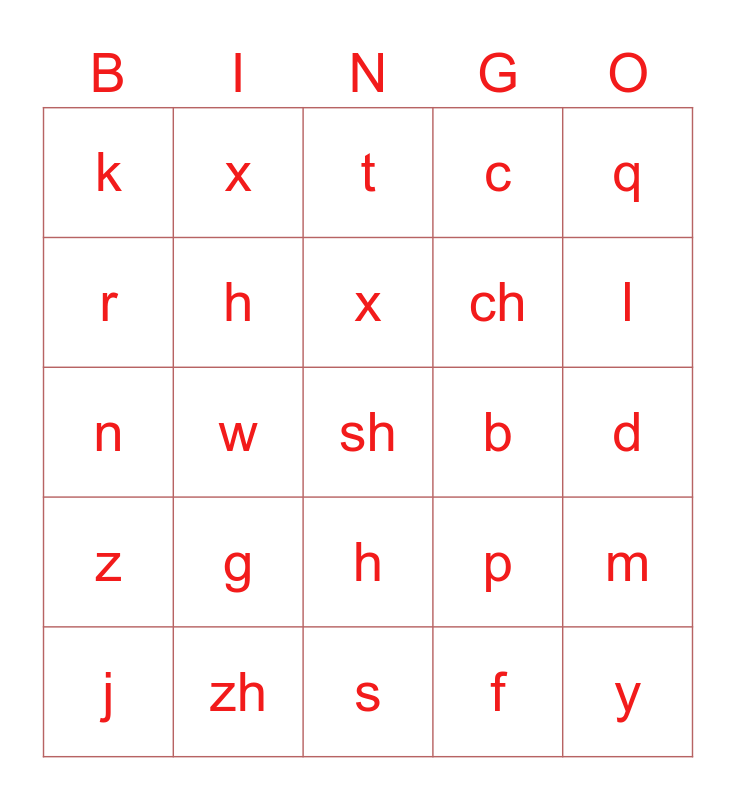 This bingo card has a free space and 24 words: g, zh, x, j, q, k, r, x, b, h, ch, n, p, m, h, f, d, t, l, w, y, z, c and s.