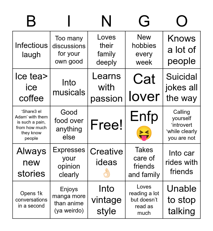 This bingo card has a free space and 24 words: Opens 1k conversations in a second, Expresses your opinion clearly, Learns with passion, Loves reading a lot but doesn’t read as much, Knows a lot of people, Infectious laugh, Too many discussions for your own good, Loves their family deeply, Enfp 😝, Calling yourself ‘introvert ‘while clearly you are not, ‘Share3 el Adam’ with them is such a pain, from how much they know people, Into musicals, Takes care of friends and family, Into car rides with friends, Ice tea> ice coffee, Enjoys manga more than anime (ya weirdo), Into vintage style, New hobbies every week, Suicidal jokes all the way, Always new stories, Good food over anything else, Creative ideas 👌🏻, Cat lover and Unable to stop talking.