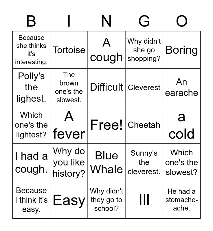 This bingo card has a free space and 24 words: Why do you like history?, Easy, Difficult, Because I think it's easy., Boring, Because she thinks it's interesting., Polly's the lighest., Tortoise, Cheetah, Blue Whale, Cleverest, Which one's the lightest?, Sunny's the cleverest., Which one's the slowest?, The brown one's the slowest., Ill, a cold, A cough, An earache, A fever, He had a stomache-ache., I had a cough., Why didn't she go shopping? and Why didn't they go to school?.