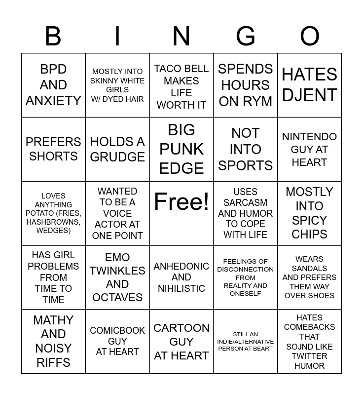 This bingo card has a free space and 24 words: MATHY AND NOISY RIFFS, EMO TWINKLES AND OCTAVES, BIG PUNK EDGE, STILL AN INDIE/ALTERNATIVE PERSON AT BEART, HATES DJENT, BPD AND ANXIETY, MOSTLY INTO SKINNY WHITE GIRLS W/ DYED HAIR, TACO BELL MAKES LIFE WORTH IT, USES SARCASM AND HUMOR TO COPE WITH LIFE, MOSTLY INTO SPICY CHIPS, LOVES ANYTHING POTATO (FRIES, HASHBROWNS, WEDGES), HOLDS A GRUDGE, FEELINGS OF DISCONNECTION FROM REALITY AND ONESELF, WEARS SANDALS AND PREFERS THEM WAY OVER SHOES, PREFERS SHORTS, COMICBOOK GUY AT HEART, CARTOON GUY AT HEART, SPENDS HOURS ON RYM, NINTENDO GUY AT HEART, HAS GIRL PROBLEMS FROM TIME TO TIME, WANTED TO BE A VOICE ACTOR AT ONE POINT, ANHEDONIC AND NIHILISTIC, NOT INTO SPORTS and HATES COMEBACKS THAT SOJND LIKE TWITTER HUMOR.
