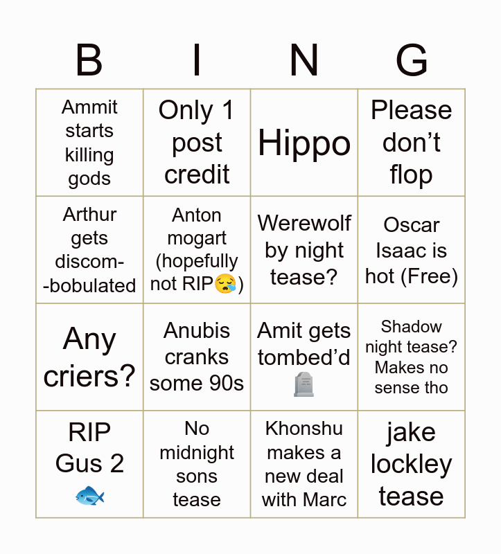 This bingo card has 17 words: Khonshu makes a new deal with Marc, RIP Gus 2 🐟, Hippo, Ammit starts killing gods, Anubis cranks some 90s, Please don’t flop, Shadow night tease? Makes no sense tho, Werewolf by night tease?, Oscar Isaac is hot (Free), Anton mogart (hopefully not RIP😪), No midnight sons tease, Amit gets tombed’d🪦, Arthur gets discom- -bobulated, Only 1 post credit, Any criers?, RANDOM BULLSHIT GO🔪🍴🗡 and jake lockley tease.