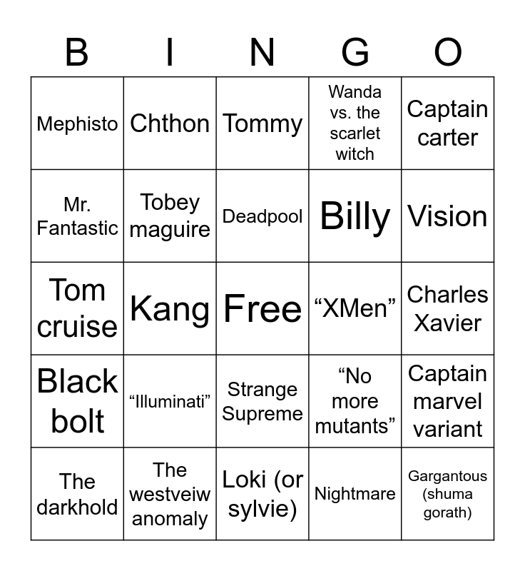 This bingo card has a free space and 24 words: “Illuminati”, The westveiw anomaly, Deadpool, The darkhold, Captain carter, Mephisto, Mr. Fantastic, Chthon, “XMen”, Strange Supreme, Billy, Tom cruise, “No more mutants”, Captain marvel variant, Tobey maguire, Nightmare, Charles Xavier, Tommy, Vision, Kang, Gargantous (shuma gorath), Black bolt, Wanda vs. the scarlet witch and Loki (or sylvie).