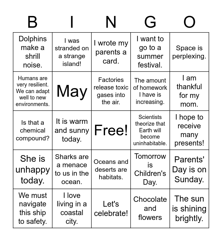 This bingo card has a free space and 24 words: Sharks are a menace to us in the ocean., I love living in a coastal city., Factories release toxic gases into the air., We must navigate this ship to safety., Space is perplexing., Dolphins make a shrill noise., Humans are very resilient. We can adapt well to new environments., I was stranded on a strange island!, Scientists theorize that Earth will become uninhabitable., Oceans and deserts are habitats., The amount of homework I have is increasing., Is that a chemical compound?, Tomorrow is Children's Day., Parents' Day is on Sunday., May, Chocolate and flowers, I hope to receive many presents!, I wrote my parents a card., I am thankful for my mom., It is warm and sunny today., The sun is shining brightly., She is unhappy today., I want to go to a summer festival. and Let's celebrate!.