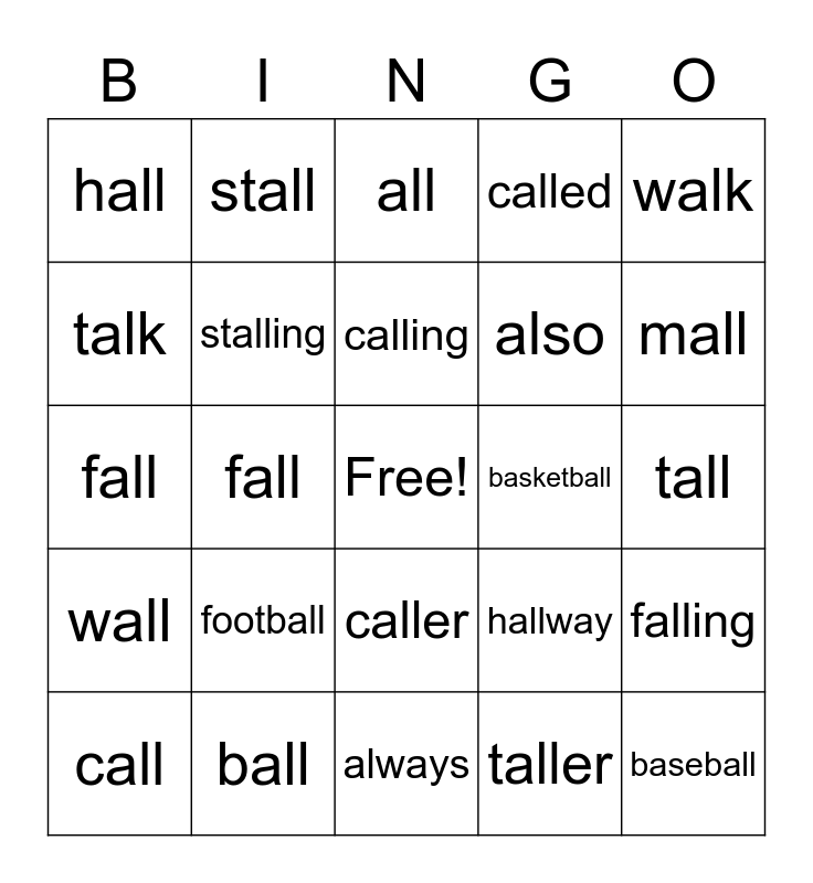 This bingo card has a free space and 25 words: call, football, calling, taller, mall, hall, stall, all, also, falling, fall, stalling, hallway, baseball, talk, ball, always, called, tall, wall, fall, caller, basketball, walk and Chalk.