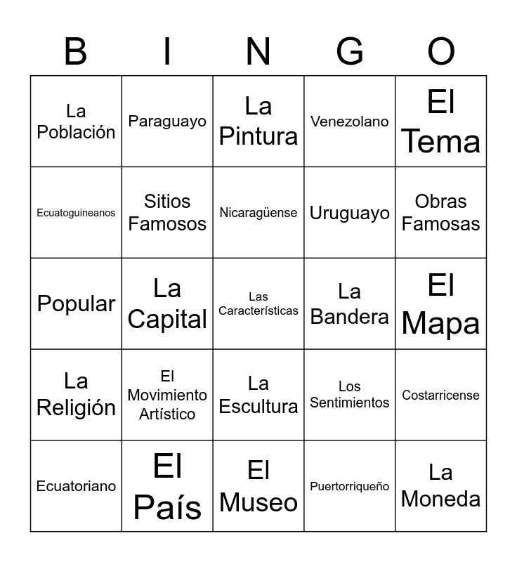 This bingo card has 30 words: El País, El Artista, La Capital, El Arte, La Población, La Pintura, Sitios Famosos, La Escultura, La Bandera, El Museo, El Mapa, Las Características, Puertorriqueño, La Moneda, Obras Famosas, Las Ciudades, Los Sentimientos, La Religión, El Movimiento Artístico, El Tema, Popular, Peruano, Paraguayo, Uruguayo, Ecuatoguineanos, Venezolano, Costarricense, Ecuatoriano, Nicaragüense and Boliviano.