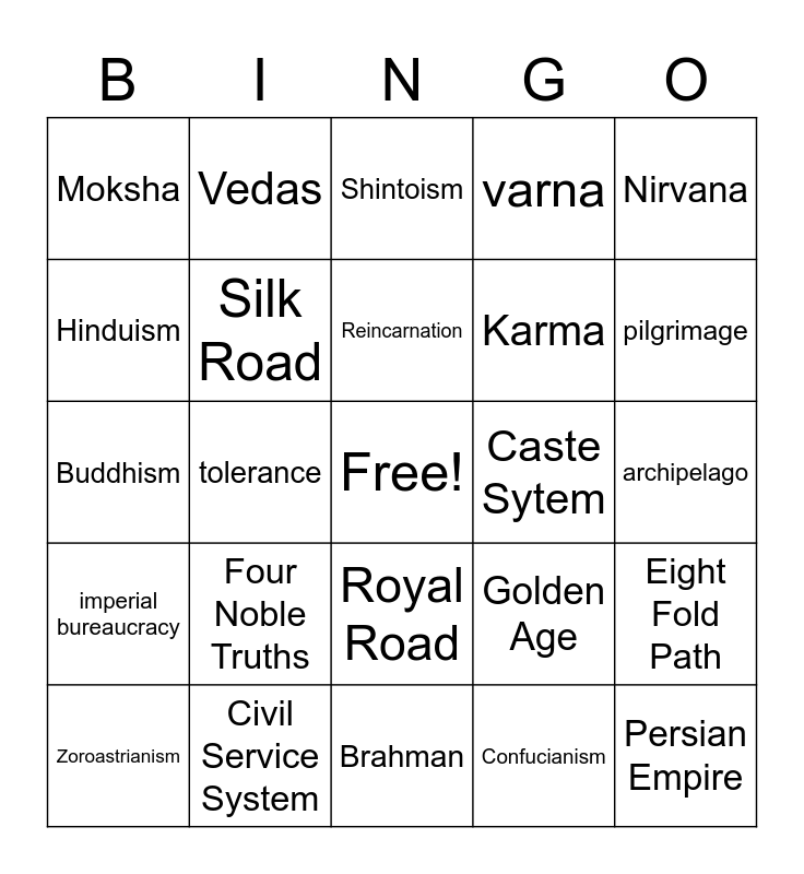 This bingo card has a free space and 24 words: Four Noble Truths, Civil Service System, Reincarnation, Zoroastrianism, Nirvana, Moksha, Hinduism, Vedas, Caste Sytem, Royal Road, Karma, Buddhism, Golden Age, Eight Fold Path, Silk Road, Confucianism, archipelago, Shintoism, pilgrimage, tolerance, Persian Empire, imperial bureaucracy, varna and Brahman.