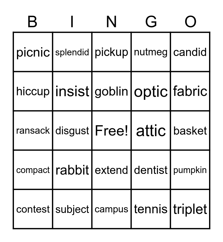 This bingo card has a free space and 29 words: contest, muffin, disgust, problem, picnic, pickup, insist, rabbit, attic, subject, basket, triplet, campus, tennis, fabric, invent, extend, compact, candid, ransack, dentist, gossip, optic, hiccup, nutmeg, splendid, pumpkin, goblin and object.