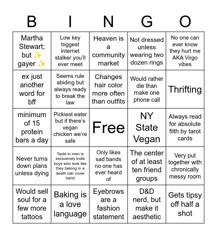 This bingo card has a free space and 24 words: Taste in men is exclusively indie boys who look like they belong in a death cab cover band, Baking is a love language, Changes hair color more often than outfits, Would sell soul for a few more tattoos, No one can ever know they hurt me AKA Virgo vibes, Martha Stewart; but ✨ gayer ✨, ex just another word for bff, Low key biggest internet stalker you’ll ever meet, NY State Vegan, Only likes sad bands no one has ever heard of, Would rather die than make one phone call, minimum of 15 protein bars a day, The center of at least ten friend groups, Very put together with chronically messy room, Seems rule abiding but always ready to break the law, D&D nerd, but make it aesthetic, Always read for absolute filth by tarot cards, Heaven is a community market, Thrifting, Pickiest eater but if there’s vegan chicken we’re safe, Gets tipsy off half a shot, Never turns down plans unless dying, Not dressed unless wearing two dozen rings and Eyebrows are a fashion statement.
