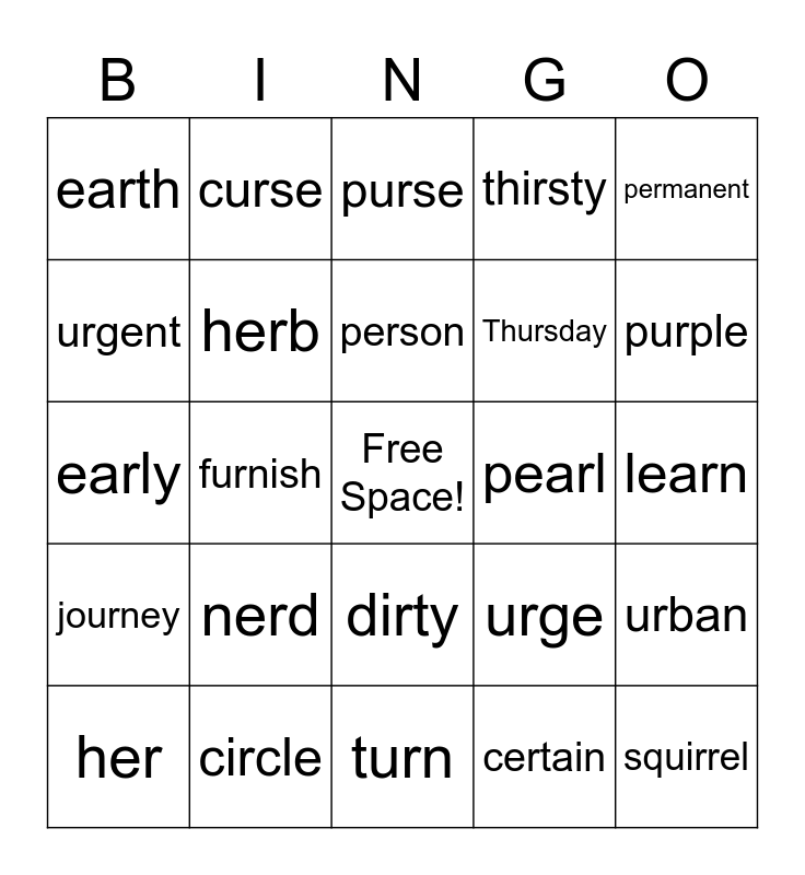 This bingo card has a free space and 24 words: her, nerd, person, certain, permanent, earth, curse, purse, pearl, learn, early, herb, urge, urban, urgent, circle, turn, thirsty, purple, journey, furnish, dirty, Thursday and squirrel.