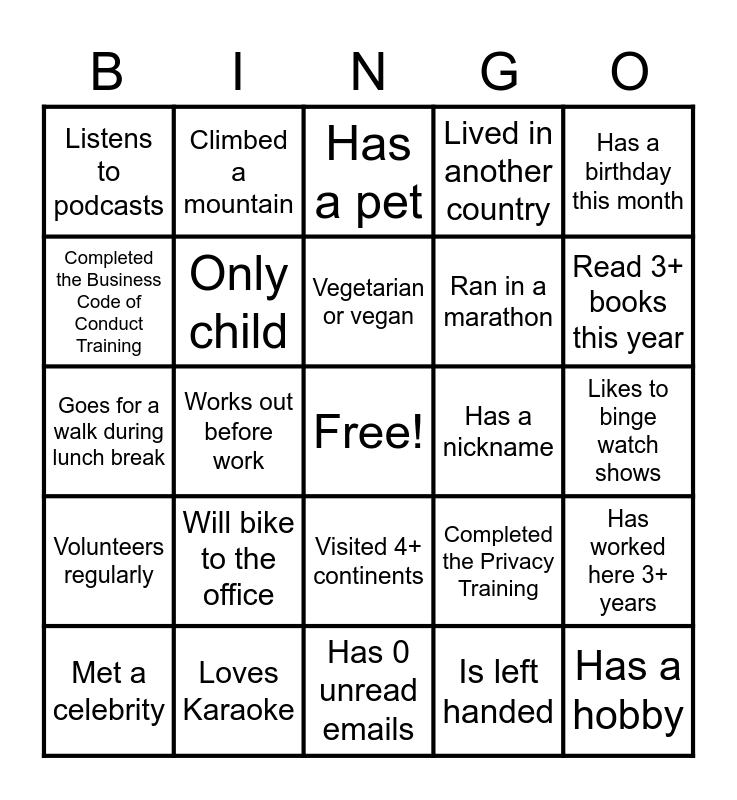 This bingo card has a free space and 24 words: Will bike to the office, Loves Karaoke, Vegetarian or vegan, Met a celebrity, Has a birthday this month, Listens to podcasts, Completed the Business Code of Conduct Training, Climbed a mountain, Has a nickname, Visited 4+ continents, Ran in a marathon, Goes for a walk during lunch break, Completed the Privacy Training, Has worked here 3+ years, Only child, Is left handed, Likes to binge watch shows, Has a pet, Read 3+ books this year, Works out before work, Has a hobby, Volunteers regularly, Lived in another country and Has 0 unread emails.