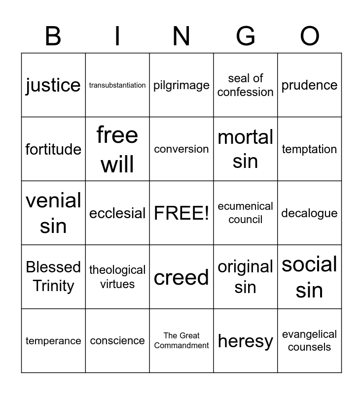 This bingo card has a free space and 24 words: theological virtues, conscience, conversion, temperance, prudence, justice, fortitude, transubstantiation, ecumenical council, creed, mortal sin, venial sin, original sin, social sin, free will, heresy, decalogue, pilgrimage, temptation, ecclesial, evangelical counsels, Blessed Trinity, seal of confession and The Great Commandment.