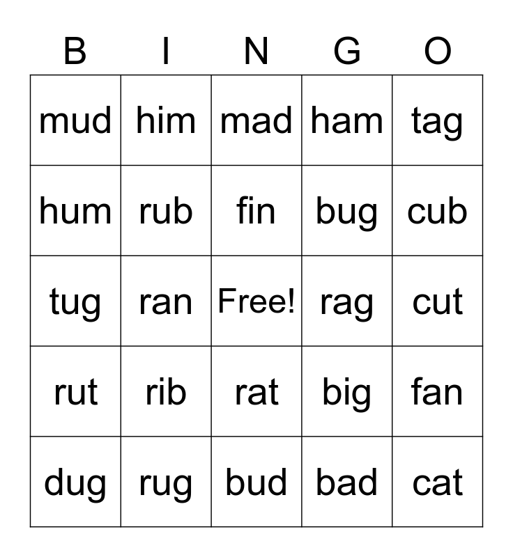 This bingo card has a free space and 29 words: dug, dig, ran, run, mud, mad, rub, rib, rag, rug, cut, cat, bud, bad, cub, cab, rat, rut, tag, tug, big, bag, bug, hum, ham, him, fan, fin and fun.