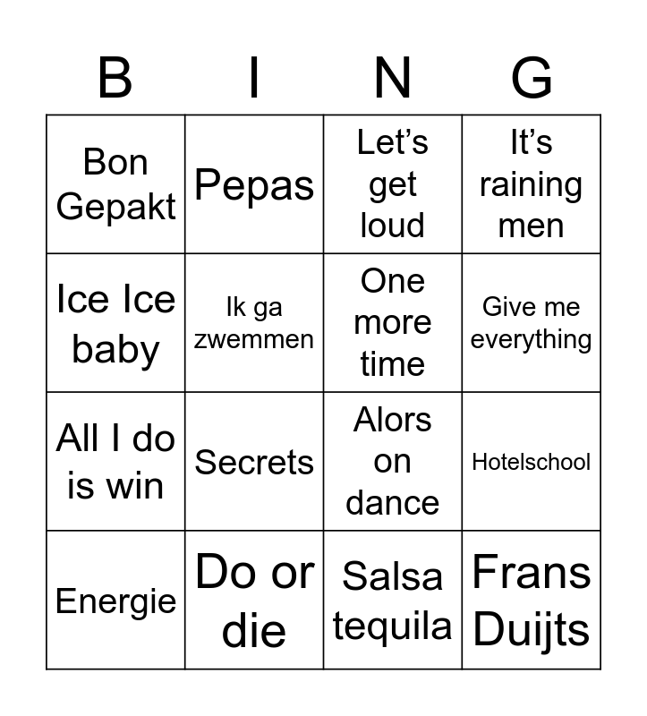 This bingo card has 16 words: Do or die, Hotelschool, Let’s get loud, Bon Gepakt, All I do is win, Pepas, Alors on dance, Salsa tequila, Ice Ice baby, Ik ga zwemmen, Energie, It’s raining men, Secrets, Give me everything, One more time and Frans Duijts.