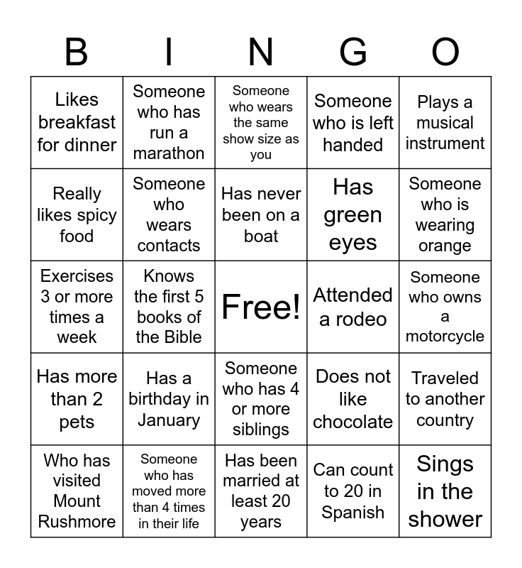 This bingo card has a free space and 24 words: Who has visited Mount Rushmore, Has a birthday in January, Has never been on a boat, Can count to 20 in Spanish, Plays a musical instrument, Likes breakfast for dinner, Someone who has run a marathon, Someone who wears the same show size as you, Attended a rodeo, Someone who owns a motorcycle, Exercises 3 or more times a week, Someone who wears contacts, Does not like chocolate, Traveled to another country, Really likes spicy food, Someone who has moved more than 4 times in their life, Has been married at least 20 years, Someone who is left handed, Someone who is wearing orange, Has more than 2 pets, Knows the first 5 books of the Bible, Someone who has 4 or more siblings, Has green eyes and Sings in the shower.