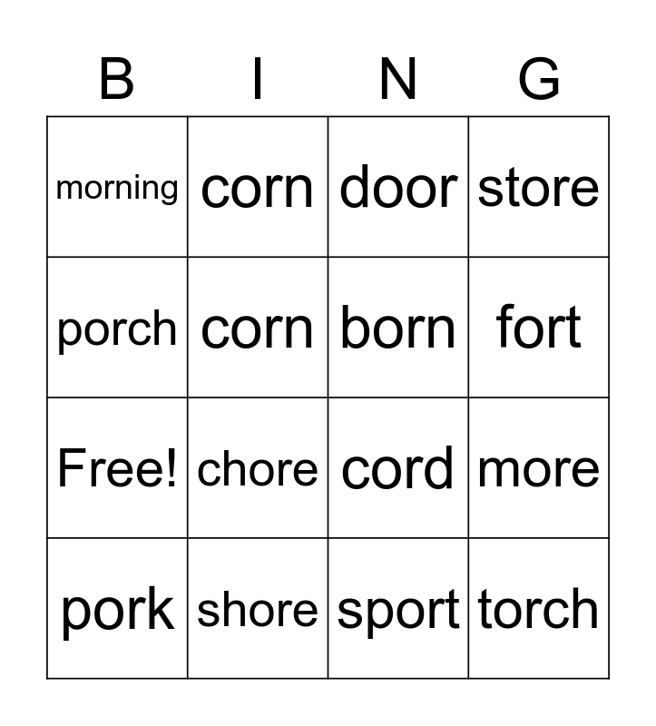 This bingo card has 20 words: more, torn, door, short, pork, porch, shore, morning, Free!, corn, chore, cord, corn, torch, born, form, fort, store, sport and horn.
