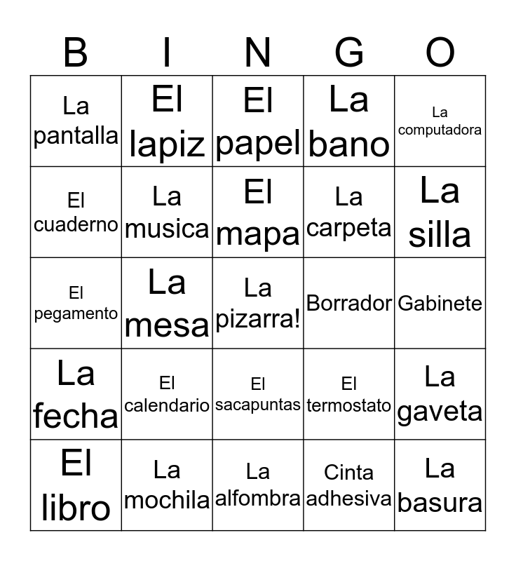 This bingo card has a free space and 24 words: El calendario, La mochila, El mapa, El libro, La computadora, La pantalla, El cuaderno, El lapiz, Borrador, El sacapuntas, La carpeta, El pegamento, El termostato, La gaveta, La musica, Cinta adhesiva, Gabinete, El papel, La silla, La mesa, La basura, La fecha, La bano and La alfombra.