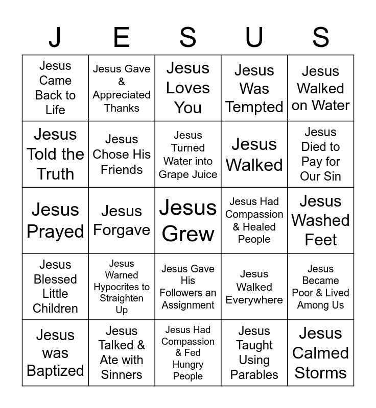 This bingo card has a free space and 24 words: Jesus Warned Hypocrites to Straighten Up, Jesus Talked & Ate with Sinners, Jesus Turned Water into Grape Juice, Jesus was Baptized, Jesus Walked on Water, Jesus Came Back to Life, Jesus Told the Truth, Jesus Gave & Appreciated Thanks, Jesus Had Compassion & Healed People, Jesus Gave His Followers an Assignment, Jesus Walked, Jesus Prayed, Jesus Walked Everywhere, Jesus Became Poor & Lived Among Us, Jesus Chose His Friends, Jesus Taught Using Parables, Jesus Washed Feet, Jesus Loves You, Jesus Died to Pay for Our Sin, Jesus Forgave, Jesus Calmed Storms, Jesus Blessed Little Children, Jesus Was Tempted and Jesus Had Compassion & Fed Hungry People.