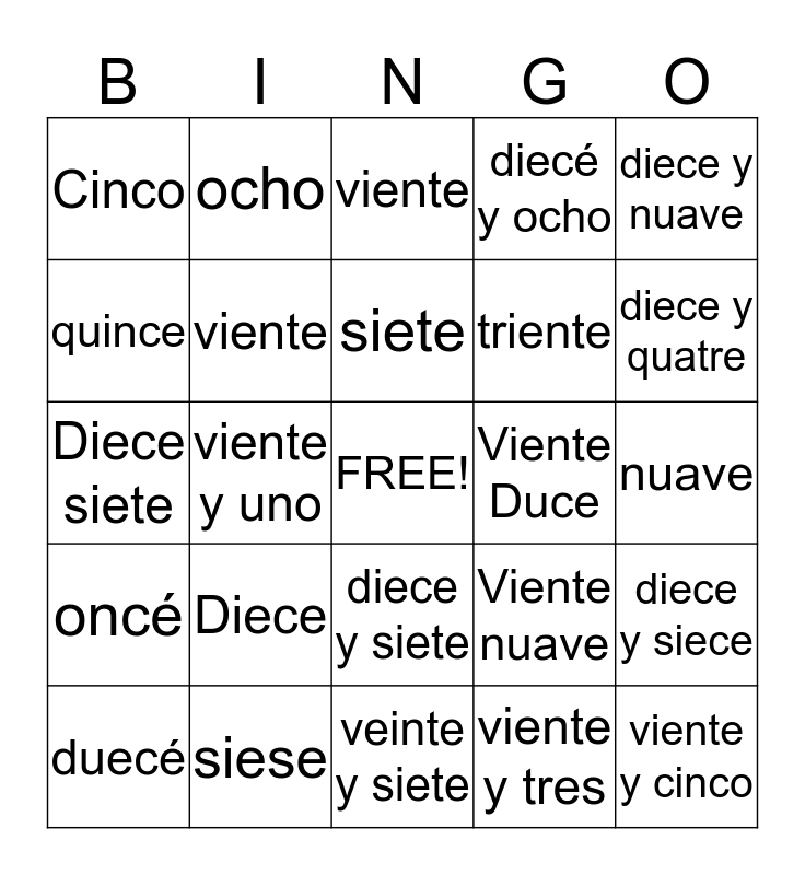 This bingo card has a free space and 24 words: Diece, siese, siete, duecé, diece y nuave, Cinco, quince, ocho, Viente Duce, diece y siete, triente, Diece siete, Viente nuave, diece y siece, viente, viente y tres, nuave, viente, diece y quatre, viente y uno, viente y cinco, oncé, diecé y ocho and veinte y siete.