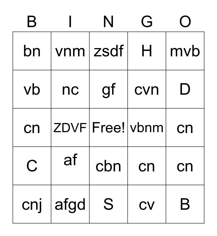 This bingo card has a free space and 24 words: af, afgd, gf, cnj, mvb, bn, vb, vnm, vbnm, cbn, cvn, cn, cn, cn, nc, cv, cn, zsdf, D, ZDVF, B, C, H and S.