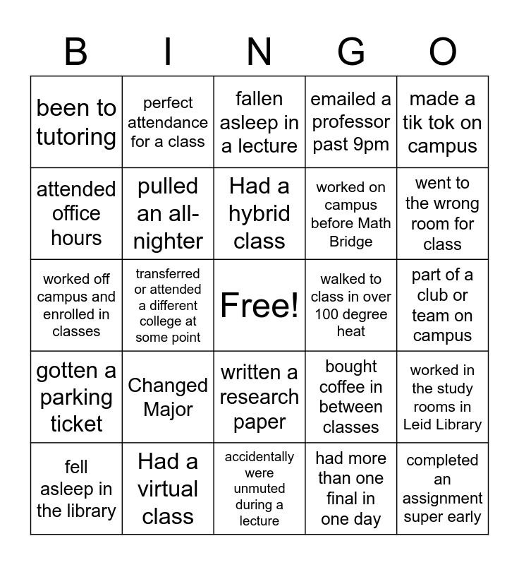This bingo card has a free space and 24 words: Changed Major, Had a virtual class, Had a hybrid class, fell asleep in the library, made a tik tok on campus, been to tutoring, attended office hours, perfect attendance for a class, walked to class in over 100 degree heat, written a research paper, worked on campus before Math Bridge, worked off campus and enrolled in classes, bought coffee in between classes, worked in the study rooms in Leid Library, pulled an all-nighter, had more than one final in one day, part of a club or team on campus, fallen asleep in a lecture, went to the wrong room for class, transferred or attended a different college at some point, completed an assignment super early, gotten a parking ticket, emailed a professor past 9pm and accidentally were unmuted during a lecture.