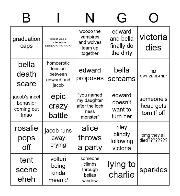 This bingo card has a free space and 29 words: tent scene eheh, carlisle and esme just looking awkward together, epic crazy battle, bad cgi rensemee, graduation caps, woooo the vampires and wolves team up together, homoerotic tension between edward and jacob, jacob runs away crying, edward doesn't want to turn her, volturi being kinda mean :/, someone's head gets torn tf off, sparkles, someone climbs through bellas window, lying to charlie, "IM SWITZERLAND", jane scaring me, alice throws a party, rosalie pops off, victoria dies, jacob's incel behavior coming out lmao, riley blindly following victoria, bella flirts with jacob, bella screams, bella death scare, edward and bella finally do the dirty, jasper was a confederate soldier???????????, omg they all died????????, edward proposes and everyone in the scene is shirtless.