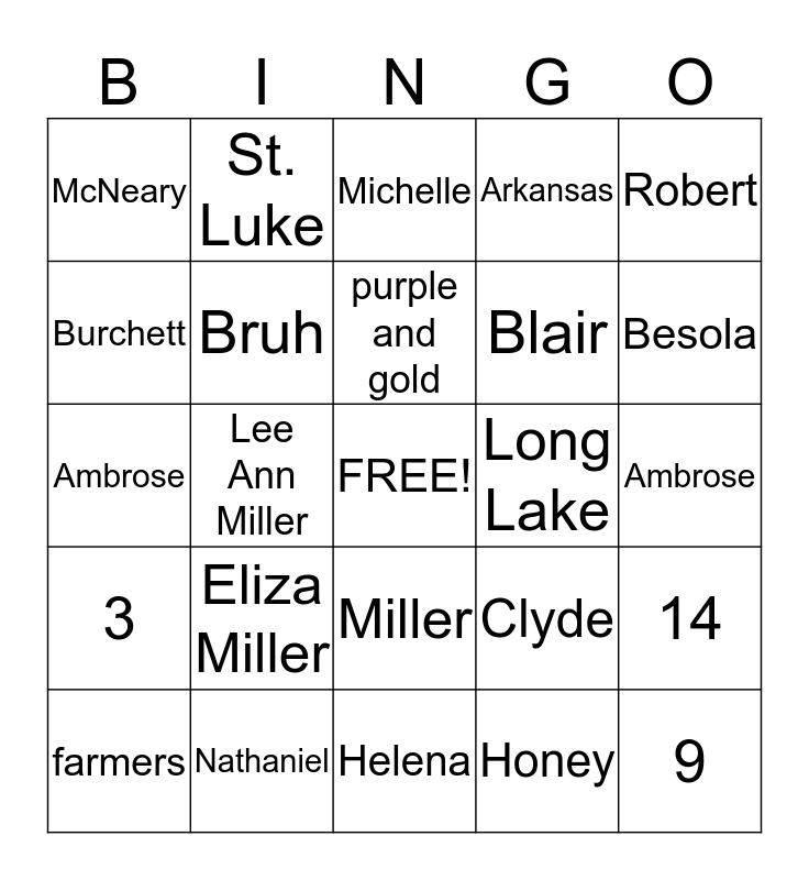 This bingo card has a free space and 24 words: Eliza Miller, Nathaniel, purple and gold, farmers, Robert, McNeary, Burchett, St. Luke, Long Lake, Miller, Blair, Ambrose, Clyde, 14, Bruh, Honey, Ambrose, Michelle, Besola, Lee Ann Miller, 9, 3, Arkansas and Helena.