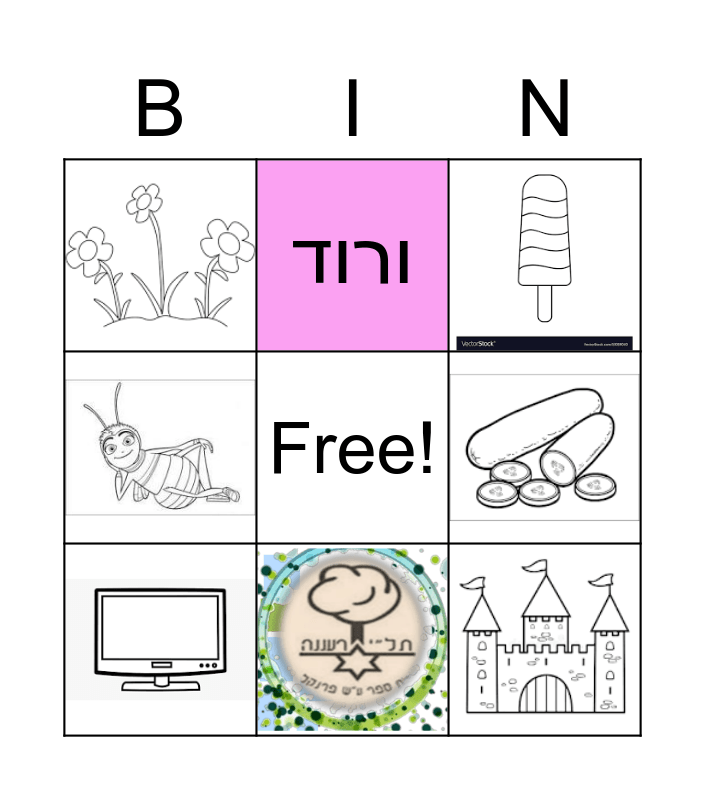 This bingo card has 16 images, a free space and 3 words: ורוד, סגול and אצות.