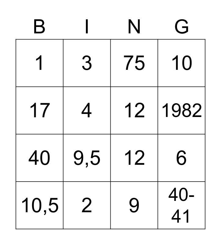 This bingo card has 16 words: 2, 6, 75, 1, 40, 3, 12, 9, 17, 4, 10,5, 10, 9,5, 1982, 12 and 40-41.