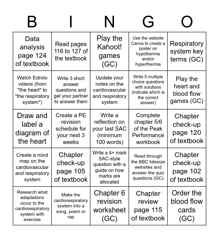 This bingo card has 25 words: Chapter check-up page 105 of textbook, Chapter 6 revision worksheet (GC), Update your notes on the cardiovascular and respiratory system, Research what adaptations occur to the cardiorespiratory system with exercise, Respiratory system key terms (GC), Data analysis page 124 of textbook, Watch Edrolo videos (from "the heart" to "the respiratory system"), Read pages 116 to 127 of the textbook, Complete chapter 5/6 of the Peak Performance workbook, Write a 4+ mark SAC-style question with a guide on how marks are allocated, Write 5 multiple choice questions with solutions (indicate which is the correct answer), Draw and label a diagram of the heart, Read through the BBC bitesize websites and answer the quiz questions (GC), Chapter check-up page 102 of textbook, Write 3 short answer questions and get your partner to answer them, Order the blood flow cards (GC), Chapter check-up page 120 of textbook, Play the Kahoot! games (GC), Play the heart and blood flow games (GC), Create a PE revision schedule for your next 3 weeks, Write a reflection on your last SAC (minimum 100 words), Make the cardiorespiratory system into a song, poem or rap, Create a mind map on the cardiovascular and respiratory system, Use the website Canva to create a poster on hypothermia and/or hyperthermia and Chapter review page 115 of textbook.