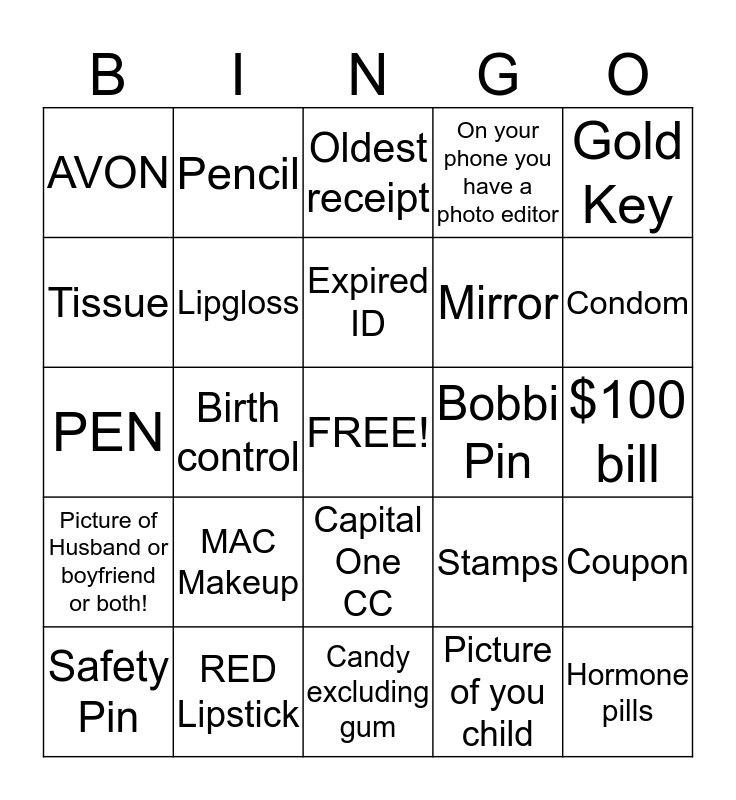 This bingo card has a free space and 24 words: MAC Makeup, RED Lipstick, Expired ID, Safety Pin, Gold Key, AVON, Tissue, Pencil, Bobbi Pin, Capital One CC, Mirror, PEN, Stamps, Coupon, Lipgloss, Picture of you child, $100 bill, Oldest receipt, Condom, Birth control, Hormone pills, Picture of Husband or boyfriend or both!, On your phone you have a photo editor and Candy excluding gum.