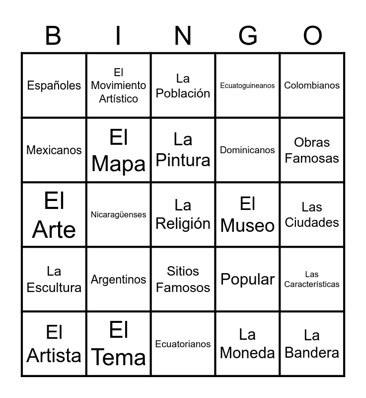 This bingo card has 30 words: El Artista, El País, La Pintura, La Capital, Colombianos, Españoles, El Movimiento Artístico, Sitios Famosos, El Museo, La Bandera, La Escultura, El Mapa, Bolivianos, La Moneda, Las Características, Los Sentimientos, Nicaragüenses, La Religión, Popular, Obras Famosas, El Arte, El Tema, La Población, Dominicanos, Las Ciudades, Mexicanos, Argentinos, Ecuatorianos, Ecuatoguineanos and Ticos.