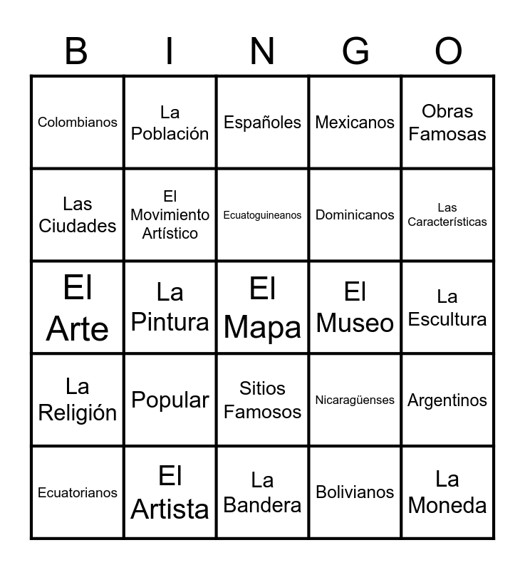 This bingo card has 30 words: El Artista, El País, La Pintura, La Capital, Colombianos, Españoles, El Movimiento Artístico, Sitios Famosos, El Museo, La Bandera, La Escultura, El Mapa, Bolivianos, La Moneda, Las Características, Los Sentimientos, Nicaragüenses, La Religión, Popular, Obras Famosas, El Arte, El Tema, La Población, Dominicanos, Las Ciudades, Mexicanos, Argentinos, Ecuatorianos, Ecuatoguineanos and Ticos.