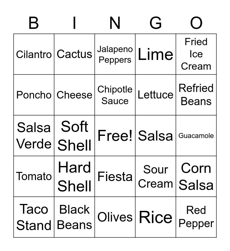 This bingo card has a free space and 29 words: Taco Stand, Pico De Gallo, Soft Shell, Sombrero, Cilantro, Jalapeno Peppers, Cheese, Hard Shell, Salsa, Black Beans, Guacamole, Red Pepper, Olives, Rice, Refried Beans, Onion, Fiesta, Tomato, Fried Ice Cream, Salsa Verde, Sour Cream, Chips, Lettuce, Poncho, Lime, Cactus, Corn Salsa, Chipotle Sauce and Meat.