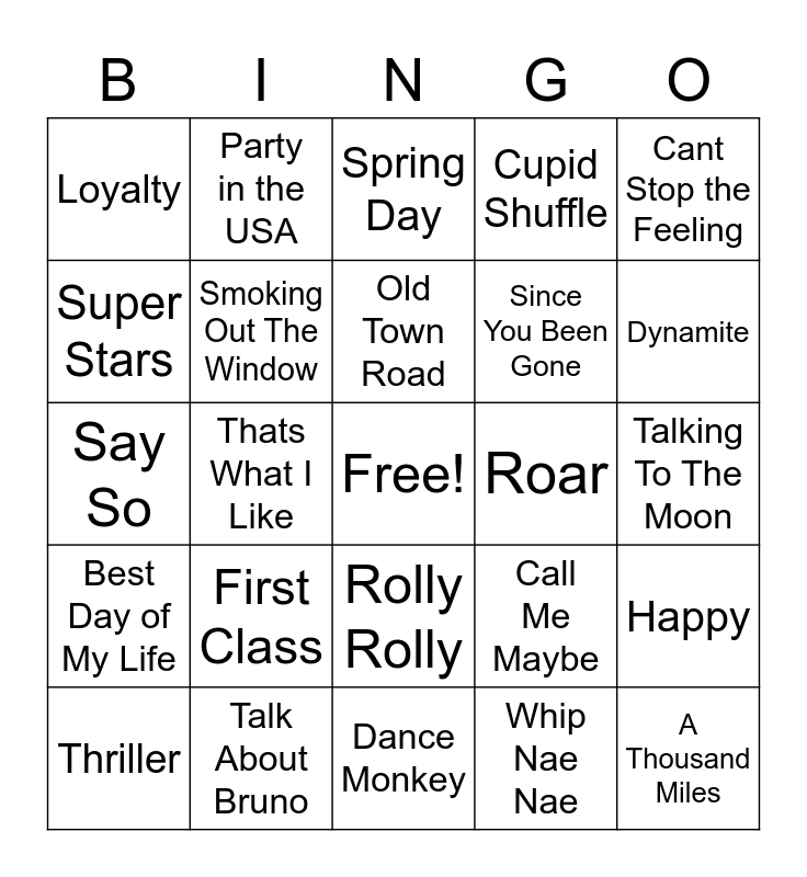This bingo card has a free space and 25 words: First Class, Dance Monkey, Old Town Road, Thriller, Cant Stop the Feeling, Loyalty, Super Stars, Party in the USA, Roar, Rolly Rolly, Since You Been Gone, Say So, Call Me Maybe, Happy, Smoking Out The Window, 24K, Talking To The Moon, Spring Day, Dynamite, Thats What I Like, A Thousand Miles, Talk About Bruno, Best Day of My Life, Cupid Shuffle and Whip Nae Nae.