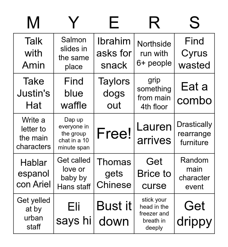 This bingo card has a free space and 24 words: Get called love or baby by Hans staff, Eli says hi, Taylors dogs out, Get yelled at by urban staff, Find Cyrus wasted, Talk with Amin, Take Justin's Hat, Salmon slides in the same place, Lauren arrives, Thomas gets Chinese, grip something from main 4th floor, Write a letter to the main characters, Get Brice to curse, Random main character event, Find blue waffle, stick your head in the freezer and breath in deeply, Drastically rearrange furniture, Ibrahim asks for snack, Eat a combo, Dap up everyone in the group chat in a 10 minute span, Get drippy, Hablar espanol con Ariel, Northside run with 6+ people and Bust it down.