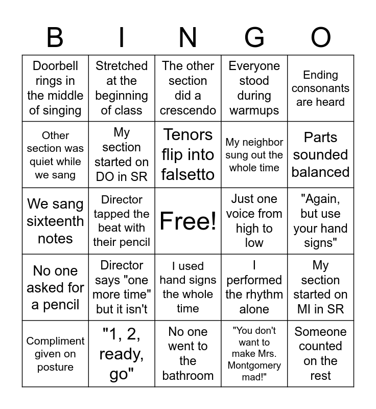This bingo card has a free space and 24 words: Director says "one more time" but it isn't, "1, 2, ready, go", Tenors flip into falsetto, Compliment given on posture, Ending consonants are heard, Doorbell rings in the middle of singing, Other section was quiet while we sang, Stretched at the beginning of class, Just one voice from high to low, I used hand signs the whole time, My neighbor sung out the whole time, We sang sixteenth notes, I performed the rhythm alone, My section started on MI in SR, My section started on DO in SR, "You don't want to make Mrs. Montgomery mad!", "Again, but use your hand signs", The other section did a crescendo, Parts sounded balanced, Director tapped the beat with their pencil, Someone counted on the rest, No one asked for a pencil, Everyone stood during warmups and No one went to the bathroom.
